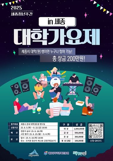 ‘2025 대학가요제 in 세종’은 지역 청년들의 문화예술 참여 확대와 음악 재능 발굴을 위한 청년 문화 프로그램이다. 청년 뮤지션들에게는 무대 경험과 성장을 위한 기회를, 시민들에게는 함께 즐길 수 있는 문화 향유의 장을 제공할 예정이다.
