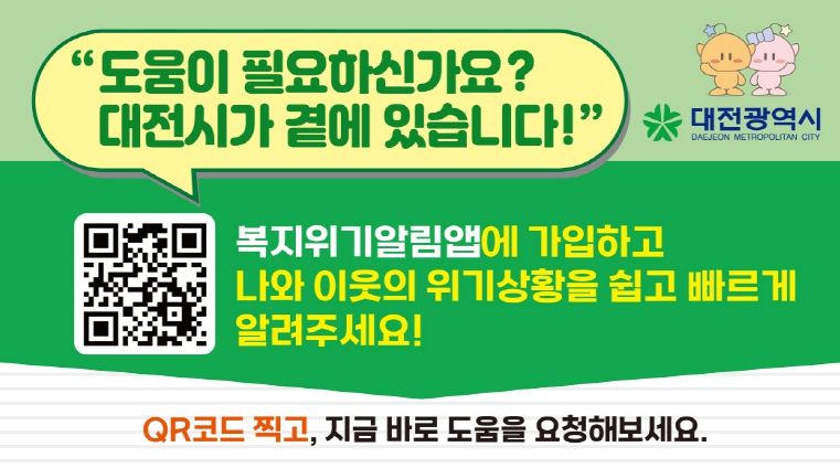 앞면에는 “도움이 필요하신가요? 대전시가 곁에 있습니다!”라는 문구와 함께 복지위기 알림서비스 QR코드를 포함했다.
