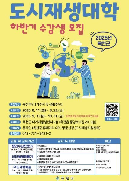 (도민방송 임경희기자) 옥천군 도시재생지원센터는 지역주민의 역량 강화와 지속가능한 도시재생 기반 마련을 위해 하반기 도시재생재학을 운영한다.