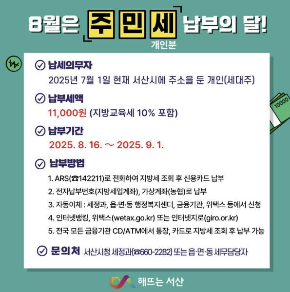 (도민방송=충남) 문성호기자 | 충남 서산시는 올해 8월 정기분 주민세(개인분) 7만 9천273건에 대해 총 8억 7천2백만 원을 부과했다고 14일 밝혔다.