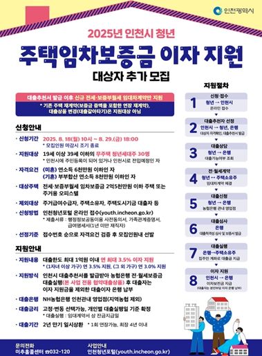 (도민방송=충남) 문성호기자 | 인천광역시는 청년들의 주거 안정성을 높이고, 경제적 부담 완화를 위해 ‘주택임차보증금 대출이자 지원사업’신규 대상자를 8월 18일부터 인천청년포털을 통해 추가 모집한다고 밝혔다.