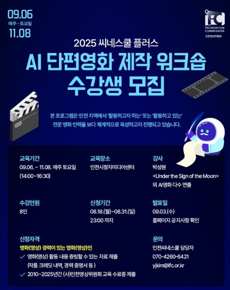 (도민방송=충남) 문성호기자 | 2025년 8월 14일 -- 인천영상위원회가 오는 18일부터 인천의 영화·영상인을 대상으로 ‘AI 단편영화 제작 워크숍’ 수강생을 모집한다.
