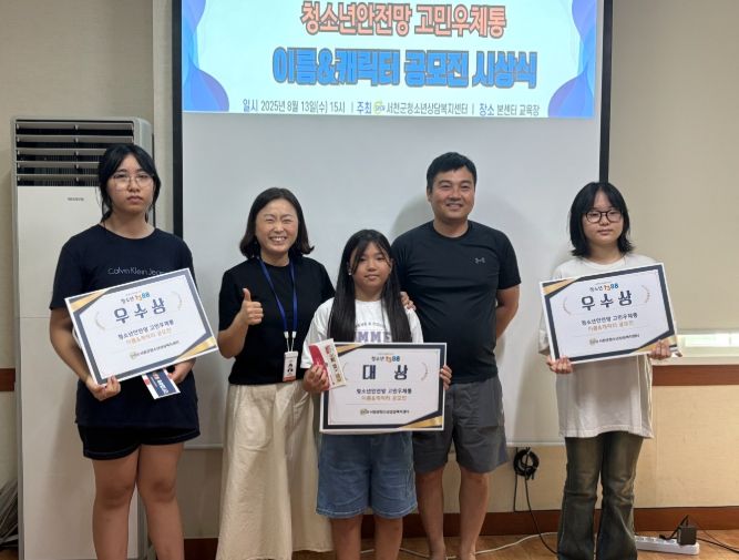 (도민방송=충남) 문성호기자 | 서천군청소년상담복지센터는 청소년들의 고민을 안전하게 나누고 건강한 성장을 지원하기 위해 마련한 ‘청소년안전망 고민우체통 이름·캐릭터 공모전’ 시상식을 개최했다.