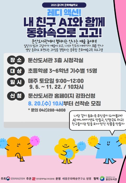 (도민방송 정연호기자) 대전 서구 둔산도서관은 문화체육관광부가 주최하고 한국문화예술교육진흥원이 주관하는 ‘꿈다락 문화예술학교’ 공모사업에 선정돼, 오는 9월부터 ‘레디 액션! 내 친구 AI와 함께 동화 속으로 고고’ 2기 프로그램을 운영한다.
