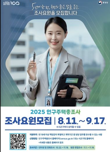 (도민방송 정연호기자) 대전 유성구는 오는 10월 22일부터 11월 19일까지 실시되는 2025년 인구주택총조사의 조사 요원을 모집한다.