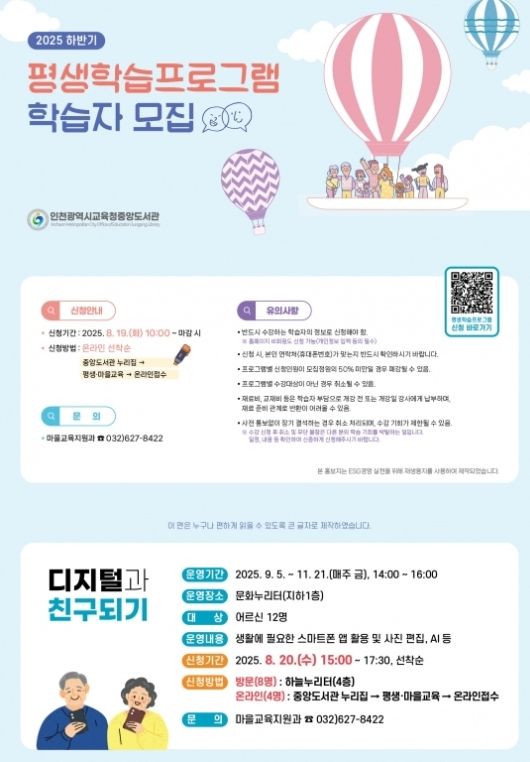 (도민방송=충남) 문성호기자 | 인천광역시교육청중앙도서관은 8월 19일 오전 10시부터 ‘2025년 하반기 평생학습프로그램’ 학습자를 모집한다.