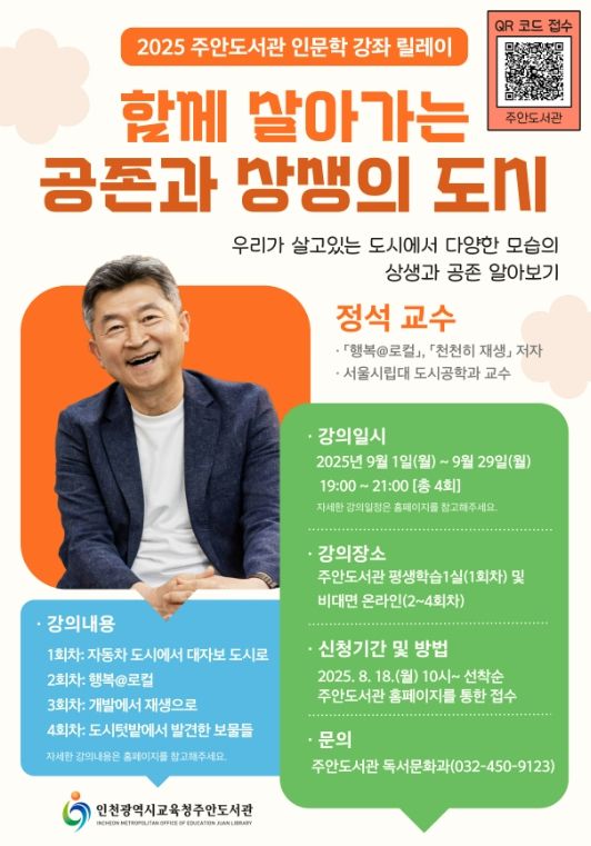 (도민방송=충남) 문성호기자 | 인천광역시교육청주안도서관은 9월 1일부터 29일까지 매주 월요일 오후 7시, 4회에 걸쳐 ‘9월 인문학 강좌 릴레이 '함께 살아가는 공존과 상생의 도시'’를 운영한다.