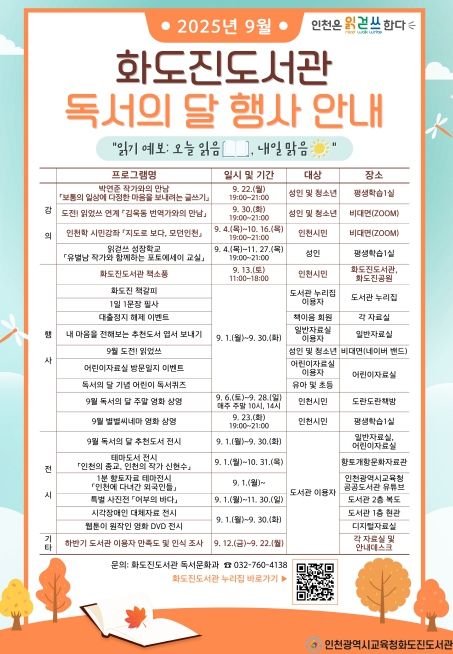 (도민방송=충남) 문성호기자 | 인천광역시교육청화도진도서관은 9월 독서의 달을 맞아 지역 주민과 함께하는 다양한 독서 문화 행사를 운영한다.