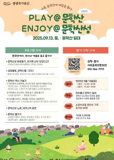 (도민방송=충남) 문성호기자 | 인천 미추홀학산문화원(원장 정형서)은 오는 9월 13일 문학산과 문학산성 일대에서 역사·자연·예술이 어우러진 특별한 문화축제 ‘플레이(Play)@문학산, 엔조이(Enjoy)@문학산성’을 개최한다.