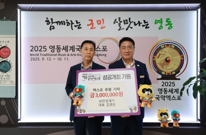 (도민방송 임경희기자) ㈜한영계기(대표 김영상)는 18일 충북 영동군청을 방문해 ‘2025 영동세계국악엑스포’의 성공적인 개최를 기원하며 후원금 300만 원을 기탁했다.
