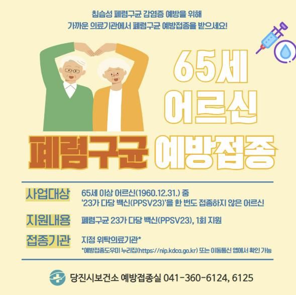 어르신 폐렴구균 무료 접종은 당진시 지정 위탁의료기관 및 당진시보건소에서 가능하며, 접종 가능 의료기관 현황은 질병관리청 예방접종도우미에서 확인할 수 있다. 접종 희망자는 반드시 사전에 지정 위탁의료기관에 접종 가능 여부를 확인하거나 보건소에 문의하면 된다.