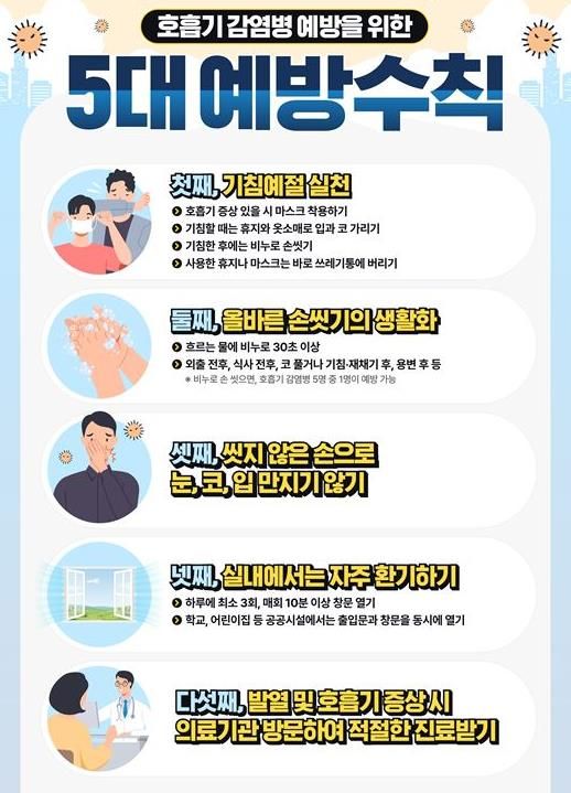 호흡기감염병 예방수칙으로 ▲코로나19 증상이 있을 시 마스크 착용과 의료기관 방문시 마스크 착용 권고 ▲발열 및 호흡기 증상이 있을 시 의료기관 방문하여 적절한 진료 받기 ▲실내에서는 자주 환기하기(2시간마다 10분씩 환기) ▲올바른 손씻기의 생활화(흐르는 물에 비누로 30초 이상 손씻기) ▲씻지 않은 손으로 눈, 코, 입 만지지 않기 ▲기침예절 실천(기침할 때는 휴지나 옷소매로 입과 코를 가리고 하기) 등이 있다.
