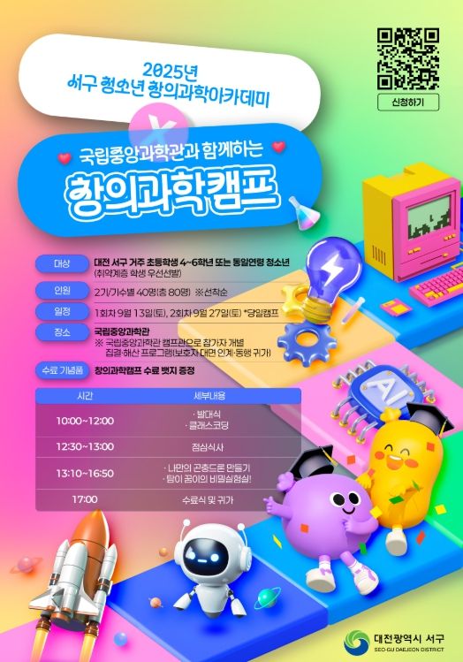 (도민방송 정연호기자) 대전 서구는 과학교육 격차 해소와 창의 인재 양성을 위해 지난 5월부터 운영한 ‘서구 청소년 창의과학아카데미’의 마지막 과정으로 ‘국립중앙과학관과 함께하는 창의 과학 캠프’ 2기 프로그램을 오는 9월 진행한다.
