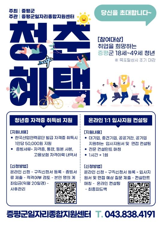 자세한 사항은 증평군일자리종합지원센터로 문의하면 된다.