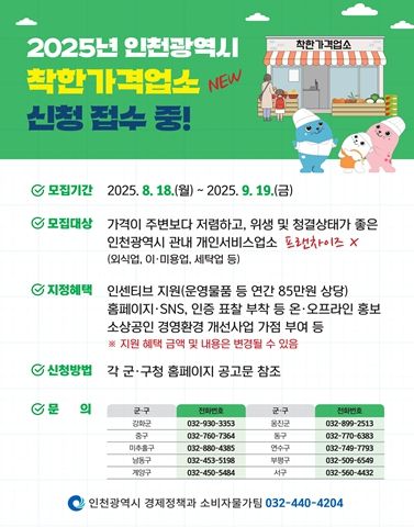 (도민방송=충남) 문성호기자 | 인천광역시는 지역 물가를 안정시키고 서민경제 지원을 위해 오는 8월 18일부터 9월 19일까지 ‘착한가격업소’를 신규 모집한다.