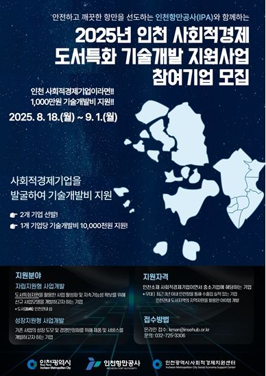 이번 공모는 8월 18일부터 9월 1일까지 진행되며 자세한 내용과 신청양식은 인천시사회적경제지원센터 누리집에서 확인할 수 있다.