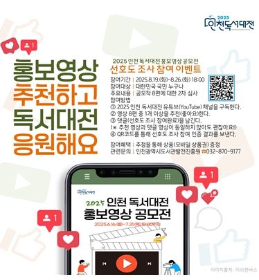 (도민방송=충남) 문성호기자 | 인천광역시는 ‘2025 인천 독서대전’ 홍보를 위한 영상 공모전의 최종 당선작 선정을 위해 8월 19일부터 8월 26일까지 온라인 시민 선호도 조사를 진행한다고 밝혔다.