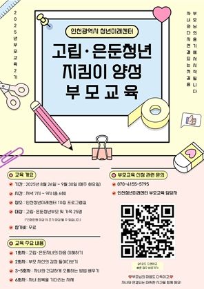 (도민방송=충남) 문성호기자 | 인천시사회서비스원 소속 인천시청년미래센터는 고립·은둔청년 지킴이 양성 부모교육 2기 참가자를 모집한다고 18일 밝혔다.