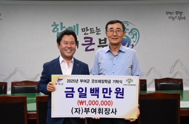 (도민방송=충남) 문성호기자 | 부여휘장사(대표 백승일)는 지난 13일 부여군청을 방문하여 인재 육성을 위한 장학금 1백만 원을 (재)부여군굿뜨래장학회(이사장 박정현)에 기탁했다.