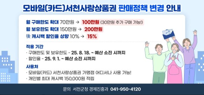 (도민방송=충남) 문성호기자 | 서천군은 8월 18일부터 서천사랑상품권 월 구매한도를 기존 70만원에서 100만원, 보유한도는 150만원에서 200만원으로 상향한다.
