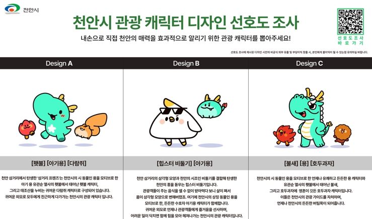 이번 조사는 천안의 역사, 문화, 관광 매력을 담아 제작된 관광캐릭터 3종 시안을 대상으로, 시민의 의견을 수렴해 향후 디자인 선정과 홍보전략에 참고하기 위해 마련됐다.