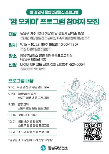 (도민방송=충남) 문성호기자 | 천안시 동남구보건소는 오는 9월 16일부터 10월 28일까지 암 경험자를 위한 통합건강증진 프로그램 ‘암 오케이’를 운영한다고 18일 밝혔다.