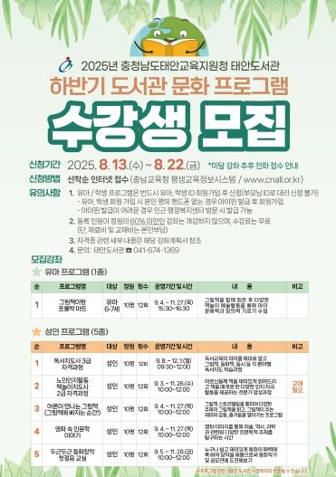 (도민방송=충남) 문성호기자 | 충청남도태안교육지원청태안도서관(관장 윤병훈)은 지난 13일부터 오는 22일(금)까지 2025년 하반기 도서관 문화 프로그램 수강생을 선착순으로 모집한다.