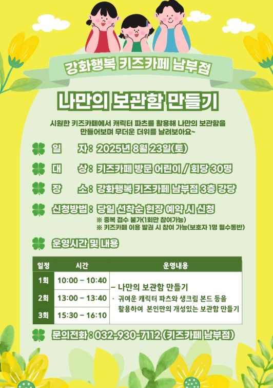 한편, 프로그램과 관련한 기타 자세한 사항은 강화군시설관리공단 홈페이지를 확인하거나, 강화행복 키즈카페 남부점으로 문의하면 된다.