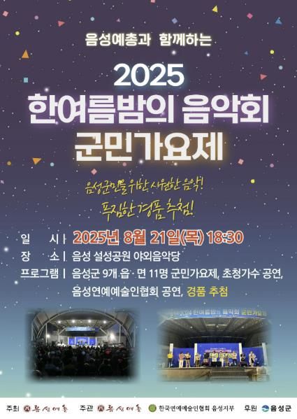 (도민방송 임경희기자) 음성군은 오는 21일 오후 6시 30분 음성 설성공원 야외음악당 일원에서 ‘2025 한여름밤의 음악회 및 군민가요제’를 개최한다고 밝혔다.