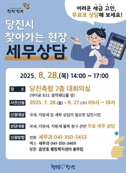 이번 상담은 8월 28일 목요일 오후 2시부터 5시까지 당진축산농협(아미로 833, 설악웨딩홀 옆) 2층 대회의실에서 진행되며, 당진시민 누구나 국세 및 지방세 전반과 지방세 불복 청구 등에 대해 전문 세무사와 1:1 무료 대면 상담을 받을 수 있다.