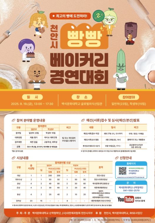 백석문화대학교 산학협력단과 (사)대한제과협회 천안시지부가 주최·주관하고 천안시와 백석문화대학교, RISE사업단이 후원하는 이번 대회는 내달 19일 백석문화대학교 글로벌외식산업관에서 열린다.