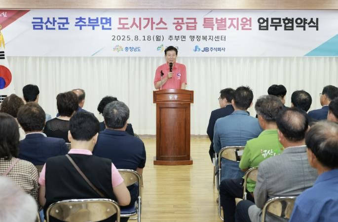 투입되는 사업비는 총 132억 원으로 △충남도 35억2000만 원 △금산군 83억6000만 원 △JB㈜ 13억2000만 원을 각자 분담해 추부면 전역에 도시가스 배관망을 설치하게 된다.