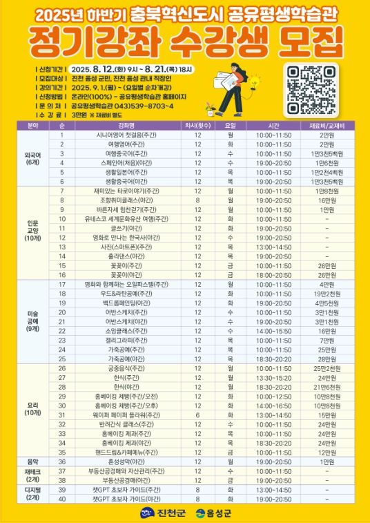수강신청은 진천-음성 평생학습 공유플랫폼을 통해 진행 중이며 오는 21일까지 진천군민과 음성군민은 누구나 신청 가능하다.