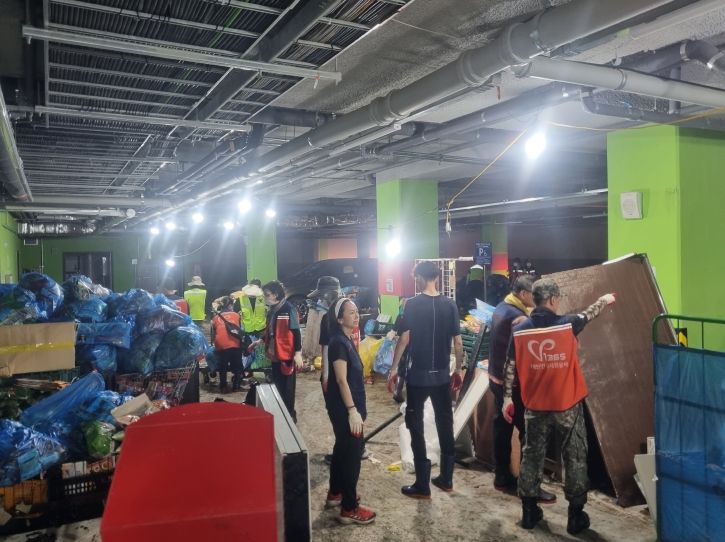 무더운 날씨와 악취 속에서도 봉사자들은 묵묵히 작업을 이어가며 피해 상가의 신속한 정상화에 힘을 보탰다.