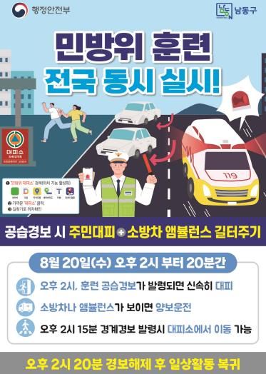 박종효 남동구청장은 “8월 민방위 훈련은 전 구민 대상 훈련으로 비상 상황에서의 행동 요령을 숙지할 중요한 기회”라며 “다소 불편하더라도 훈련에 적극 참여해 주시길 바란다”라고 말했다.