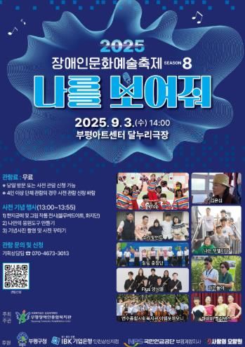 (도민방송=충남) 문성호기자 | 부평구 부평장애인종합복지관은 오는 9월 3일 부평아트센터 달누리극장에서 2025년 장애인문화예술축제 ‘나를 보여줘-시즌8’을 개최한다.