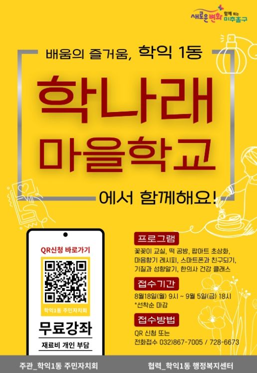 (도민방송=충남) 문성호기자 | 미추홀구 학익1동 주민자치회(회장 이상기)는 주민들의 삶의 질 향상과 이웃 간 소통을 위해 학습 프로그램 ‘학나래 마을 학교’를 오는 9월 운영한다.
