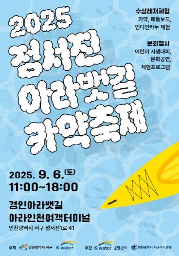 (도민방송=충남) 문성호기자 | 인천 서구는 오는 9월 6일 토요일 11시부터 18시까지 아라인천여객터미널 일원에서 남녀노소 안전하게 즐기는 수상레저 축제인 '2025 정서진 아라뱃길 카약축제'를 한국수자원공사 아라뱃길지사(K-water)와 공동으로 개최한다고 19일 밝혔다.