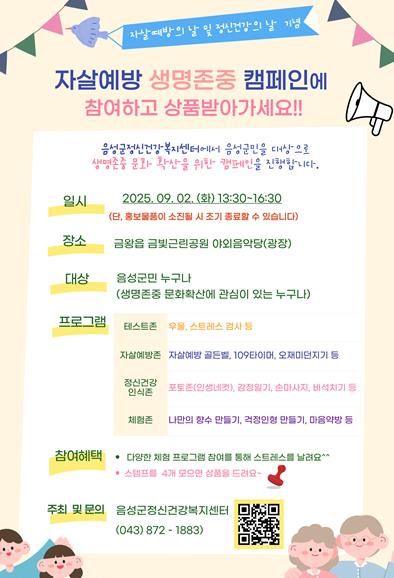 (도민방송 임경희기자) 음성군정신건강복지센터는 2025년 세계자살예방의 날을 맞이하여 생명존중 문화 확산을 위한 기념행사를 9월 1일과 9월 2일 양일간에 걸쳐 개최할 예정이다.