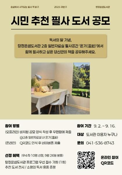 (도민방송=충남) 문성호기자 | 아산시 탕정온샘도서관이 독서의 달을 맞아 ‘시민 추천 필사 도서 공모’를 진행한다.