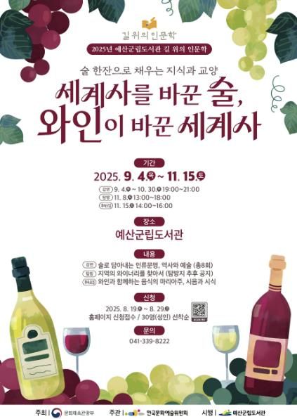 예산군립도서관 관계자는 “이번 프로그램은 인문학적 시선으로 술을 바라보는 신선한 기회를 제공할 것”이라며 “지역 주민들이 쉽고 즐겁게 인문학에 접근할 수 있는 계기가 되길 바란다”고 전했다.
