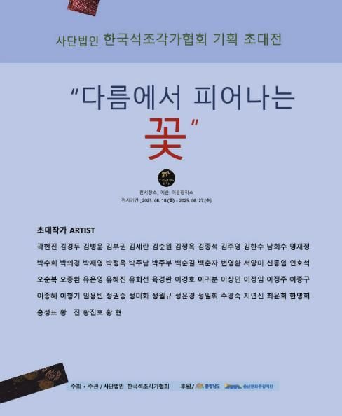 (도민방송=충남) 문성호기자 | 예산군은 사단법인 한국석조각가협회주관으로 ‘다름에서 피어나는 꽃’ 특별 기획 초대전을 8월 18일부터 27일까지 예산 이음창작소 대전시실에서 개최한다고 밝혔다.