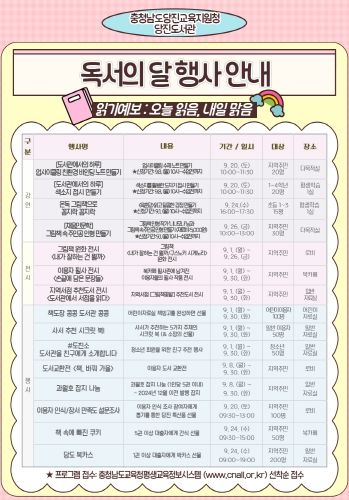 (도민방송=충남) 문성호기자 | 충청남도당진교육지원청 당진도서관은 9월 독서의 달을 맞아 독서의 즐거움을 알리기 위한 풍성한 독서문화 행사를 운영한다고 밝혔다.