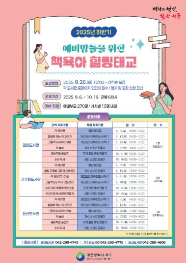 (도민방송 정연호기자) 대전 서구는 임신부의 정서적 안정을 지원하고 지역사회 내 독서 중심 육아 문화를 조성하기 위해, ‘예비맘을 위한 책 육아 힐링 태교’를 오는 9월 6일부터 10월 19일까지 갈마·가수원·둔산도서관에서 운영한다.