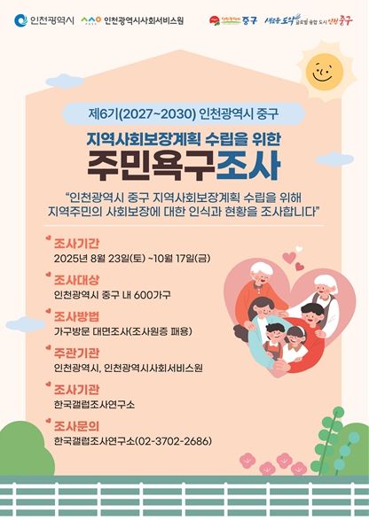 내년 6기(2027~2030) 시, 군·구 지역사회보장계획 수립에 앞서 진행하는 것으로 ‘사회보장급여의 이용·제공 및 수급권자 발굴에 관한 법률’에 따른 법정 조사다. 인천시 사회보장정책 방향을 설정하는 기초 자료로 활용한다.