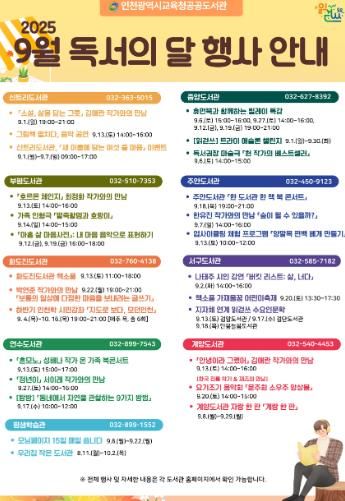 (도민방송=충남) 문성호기자 | 인천광역시교육청은 소속 8개 공공도서관과 평생학습관에서 9월 독서의 달을 맞아 ‘읽기 예보: 오늘 읽음, 내일 맑음’을 주제로 다양한 독서 문화 행사를 운영한다고 20일 밝혔다.