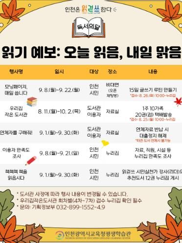(도민방송=충남) 문성호기자 | 인천광역시교육청평생학습관은 9월 독서의 달을 맞아 비대면 글쓰기 프로그램 ‘모닝페이지, 매일 씁니다’를 운영한다.