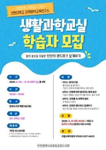 (도민방송=충남) 문성호기자 | 인천광역시교육청중앙도서관은 8월 29일부터 9월 19일까지 초등학교 1~3학년을 대상으로 ‘2025 생활과학교실’을 운영한다.