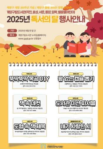 (도민방송=충남) 문성호기자 | 인천 계양구립도서관[(재)인천광역시계양구인재양성장학교육재단]은 9월 독서의 달을 맞아 각 도서관에서 다채로운 행사를 운영한다고 밝혔다.