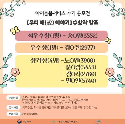시상 및 부상은 수상자가 직접 아이돌봄광역지원센터(보람종합복지센터 2층)로 방문해 신분 확인을 거쳐 수령하면 된다.